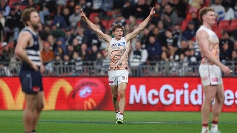 The 21-year-old put the GIANTS in command with four goals when the match was up for grabs in the third term, then booted two more majors after the last break to help steer his side to a 26-point victory over the Cats on Saturday.