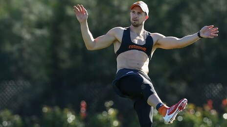 This weekend’s clash with Fremantle will be the first game in orange and charcoal for the club’s gentle GIANT, Dawson Simpson.